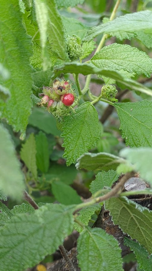 Medium sized shrub with dark crimson berries that the birds love. They do reseed readily throughout the garden.